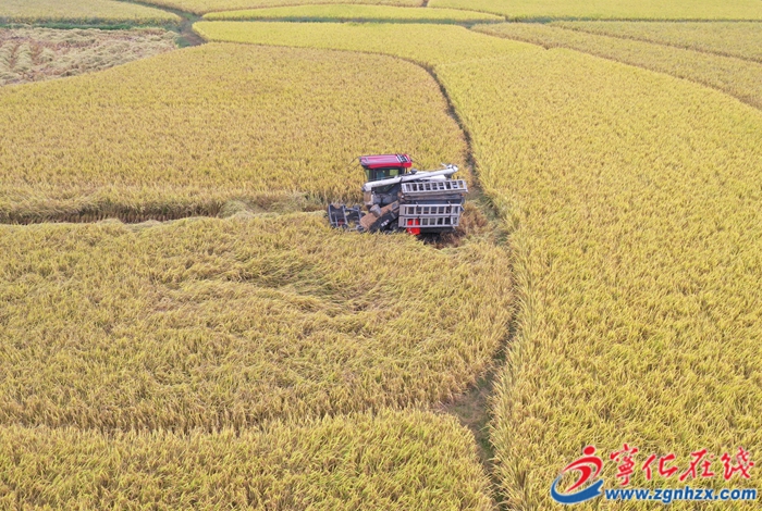 近日,在石壁鎮陂下村的連片稻田里,收割機來回穿梭,一排排稻子連桿帶穗被卷入機械中,割稻、脫粒、粉碎、裝袋等工序一氣呵成。