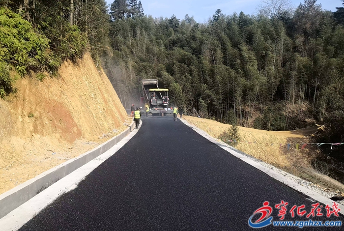 近日,在寧化縣治平畬族鄉五黃線五福橋至黃精岌道路施工現場,裝載車、攤鋪機、壓路機等施工車輛來回穿梭,瀝青路面逐漸成型。