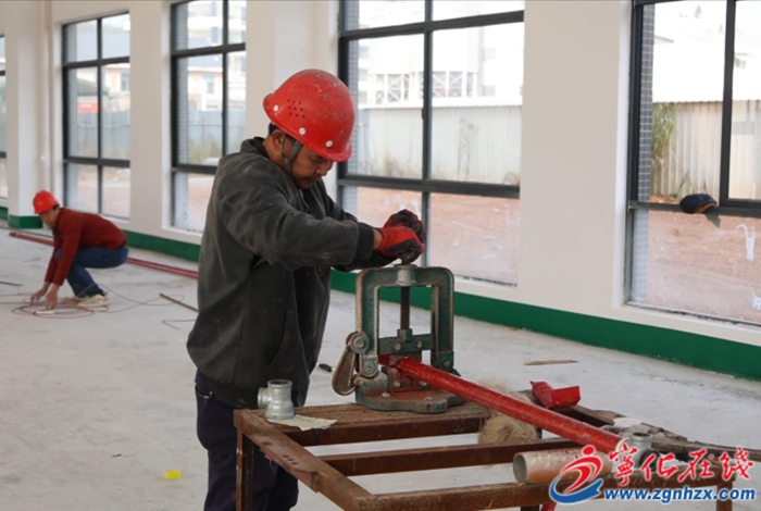 1月8日,在寧化縣薏米·河龍貢米精深加工項目建設現場,工人正進行室內水電、消防管道安裝等工作。