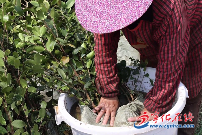 近日,在方田鄉,幾名工人正將一株株長林系列油茶樹苗根部浸入泥漿中,濕潤根部,防止失水,為當地千畝油茶種植林種植提供健康樹苗;另一邊,幾十名村民頭戴草帽、手持鋤頭,將一株株翠綠的油茶苗栽入土壤中,一派熱火朝天的勞作景象。