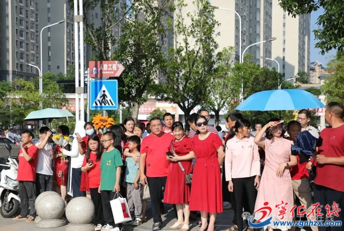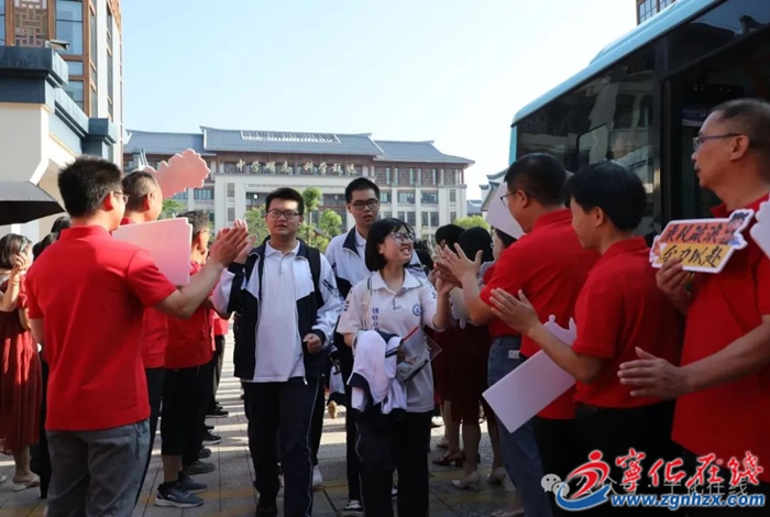 上午7點半,寧化縣濱江實驗中學校門口,9輛“愛心送考”公交車早早地停靠在校門口,免費為考生提供接送服務。家長和老師們化身應援團“花式”送考:老師們身著喜慶的紅色T恤,手持寫有“金榜題名”“全力以赴”“高考必勝”等字樣的應援牌列隊歡送,為每一位學子擊掌鼓勵,傳遞信心與力量。家長們準備了旗袍、花束、條幅等讓人目不暇接,滿滿氛圍感。