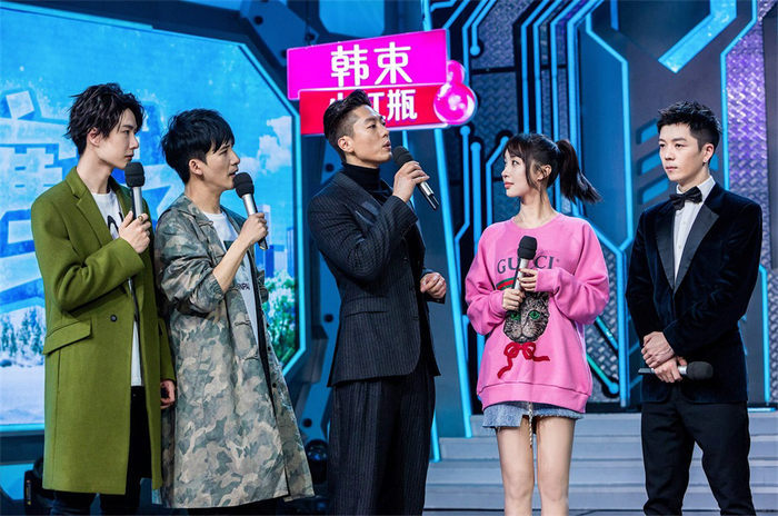 節目中,李菲兒身著粉色衛衣搭配牛仔短裙亮相,大秀美腿,與凌瀟肅、王櫟鑫等一群身穿大衣、腿裹長褲的男士們站在一起,顯得格外亮眼。