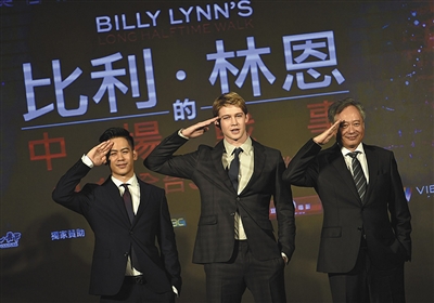 李淳與父親李安、喬·阿爾文一同宣傳《比利·林恩的中場戰事》。