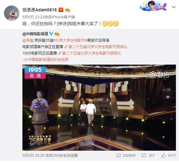 搜狐娛樂訊 5月6日,第25屆北京大學生電影節在京召開,李晨榮獲“最受歡迎導演 ”獎,隨后范丞丞轉發并配文道:“姐,你還在拍嗎?我姐夫拿大獎了!”疑似坐實二人好事將近!