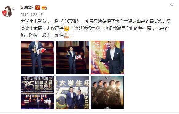 李晨得獎后,范冰冰也在自己微博發文祝賀并暖心表白:“大學生電影節,電影《空天獵》,李晨導演獲得了大學生評選出來的最受歡迎導演獎!我哥,為你高興!請繼續努力喲!也很感謝同學們的每一票,未來的路,陪你一起走,加油! ”