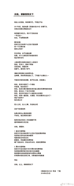 《英雄本色2018》在今年1月18日上映,到2月底,該片票房成績以6303萬而終結。影片口碑確實非常一般,相對于影片據傳上億的投資,這個成績確實讓人比較泄氣。于是,丁晟導演率先發公開信詢問“霍爾果斯青春光線影業”,2700萬的宣發費用和1000萬的票補是怎么花的。