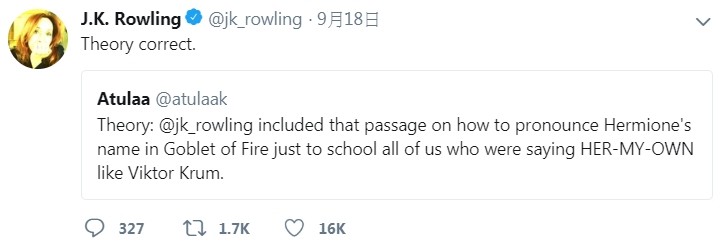 有網(wǎng)友近來便在推特詢問J.K.羅琳,是不是故意安排這段劇情,教粉絲如何正確想出“Hermione”,因?yàn)椴簧偃藭?huì)想成“Her-my-own”,沒想到J.K.羅琳回復(fù)“這個(gè)理論是正確的”。