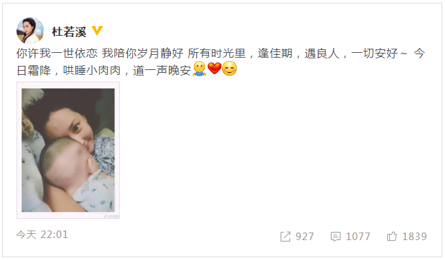 10月23日晚,杜若溪通過微博曬哄女兒睡覺的照片,并配文稱:“你許我一世依戀,我陪你歲月靜好。所有時光里,逢佳期,遇良人,一切安好!今日霜降,哄睡小肉肉,道一聲晚安!”
