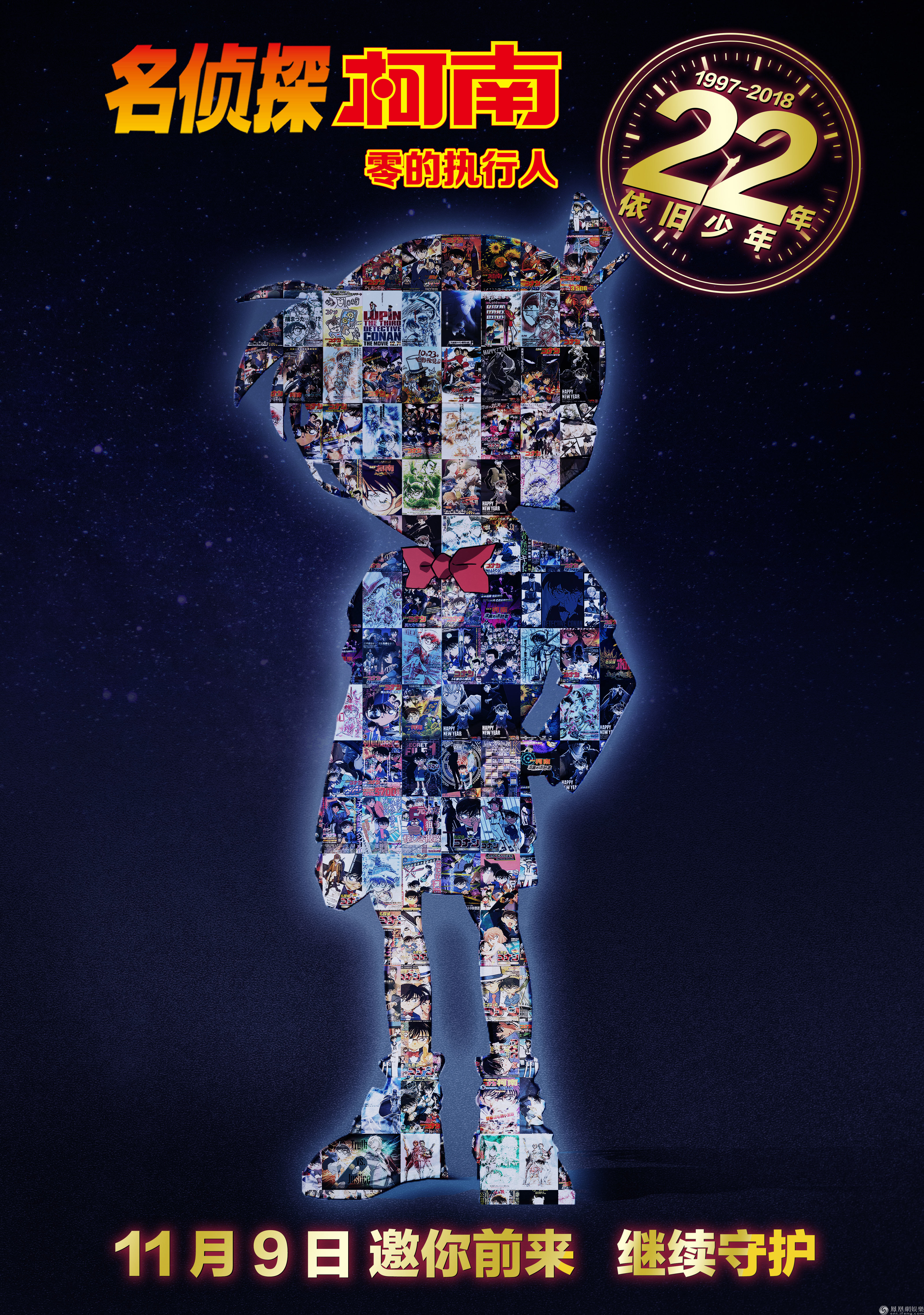 《名偵探柯南》劇場版自從97年第一部上映以來,已經(jīng)陪伴粉絲們走過了超過二十個年頭,乘著第22部劇場版電影《名偵探柯南:零的執(zhí)行人》即將在11月9日國內(nèi)上映之際,有忠粉為電影制作了“22周年紀念”版海報。海報利用近年來所有柯南劇場版的官方與飯制海報組合成大家非常熟悉的柯南經(jīng)典形象剪影,配上深藍神秘感背景,整個海報顯得十分帥氣。