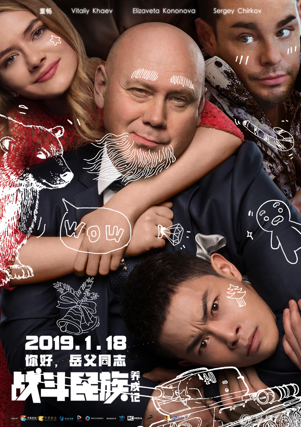 最新曝光的“圣誕休戰”版海報中,岳父大人一家被畫上節日涂鴉,在小熊、姜餅人,圣誕樹等元素的襯托下,溫情溢出。但仔細觀察,卻可以發現溫馨的氛圍底下卻暗含洶涌的角力:被畫上白胡子的岳父嘴唇微微上翹,下手臂卻用力夾著中國女婿的頭;被岳父纏著脖子的女婿眉頭緊皺,仿佛察覺到自己女朋友的前度在背后虎視眈眈從中作梗;只有左上角的“小公主”伊拉仿佛被蒙在鼓里,一副歲月靜好的樣子,4人組合起來的場面非常逗趣,網友直呼“感覺這是戰斗民族版最后的晚餐!”。