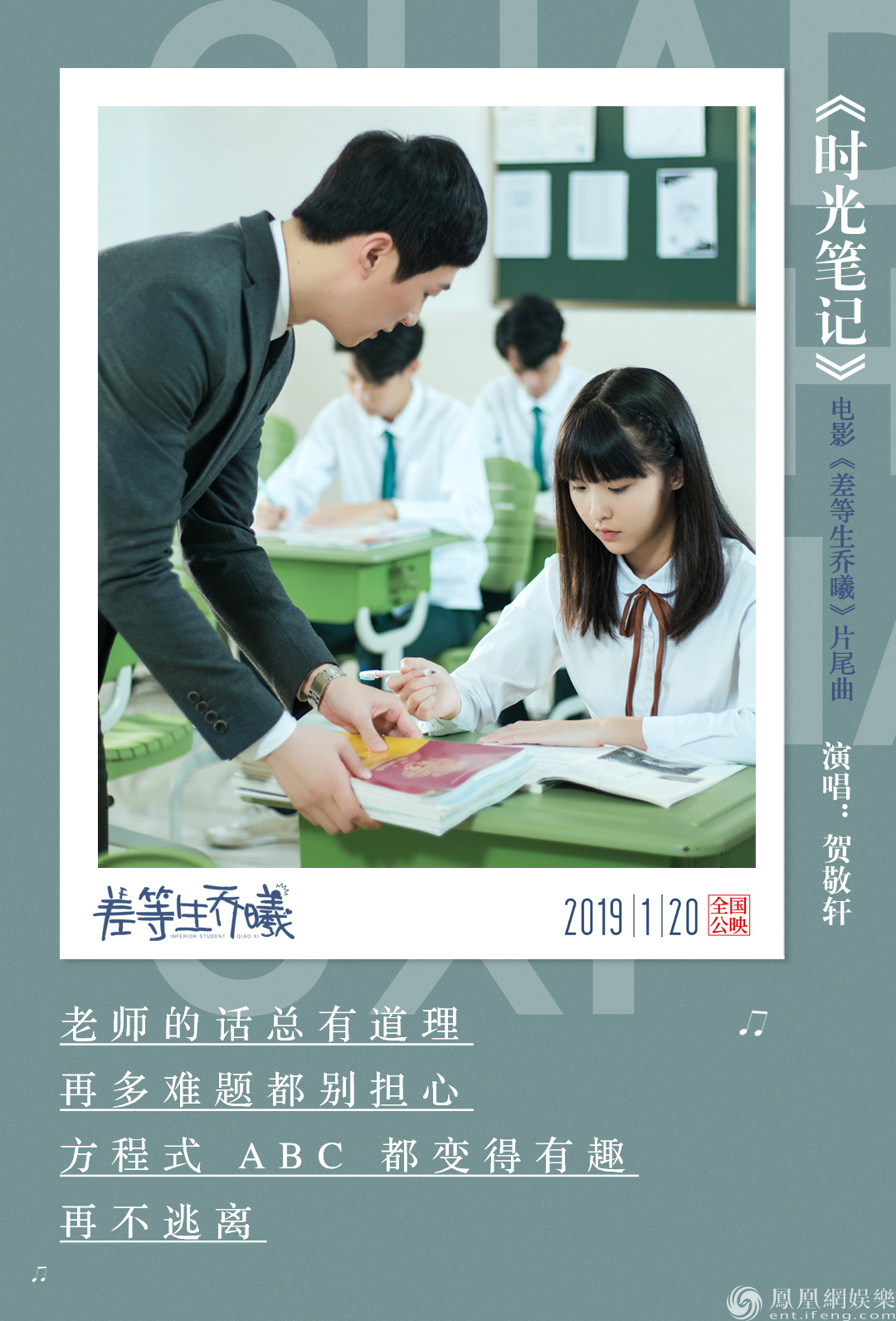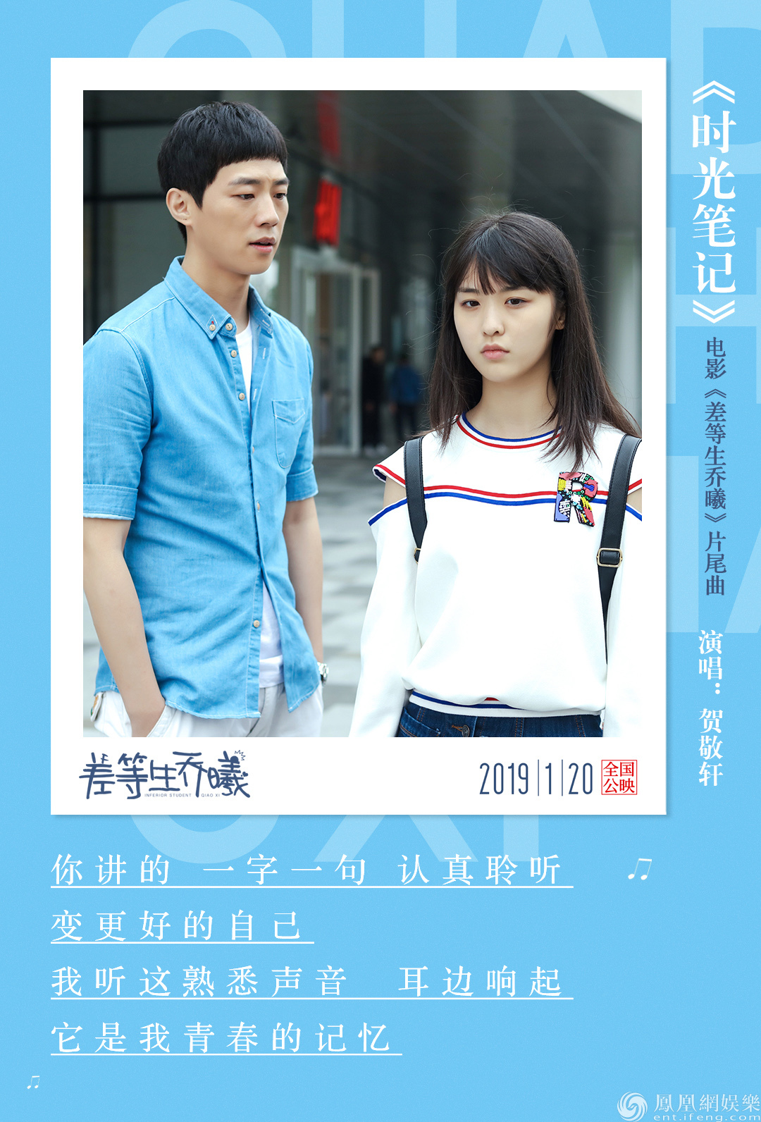 電影《差等生喬曦》演唱的片尾曲《時(shí)光筆記》由“元?dú)獠排?rdquo;賀敬軒獻(xiàn)唱。甜美的嗓音配以輕快的旋律,讓人有一張如沐春風(fēng)的感覺(jué),找回了青春年少時(shí)漫步在校園中的那份愜意。海報(bào)中曲蘭蘭(楊麗曉飾)和喬曦站在校園的操場(chǎng)上,曲蘭蘭看著喬曦,喬曦望向遠(yuǎn)方,兩人臉上都掛著微笑,讓人覺(jué)得歲月靜好。