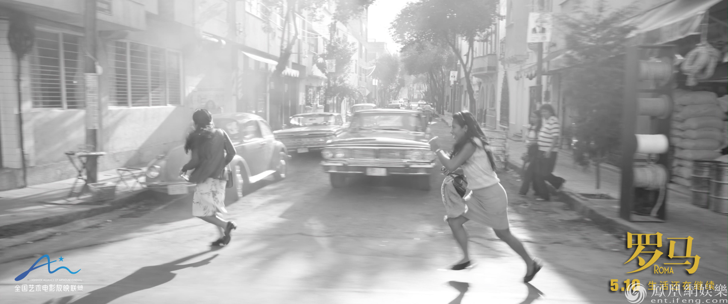 影片運(yùn)用了大量固定鏡頭與橫搖鏡頭的拍攝手法,今日片方發(fā)布的片段中橫移鏡頭對(duì)準(zhǔn)了女傭在戶外街頭奔跑的情景,這一片段既展現(xiàn)了70年代墨西哥的社會(huì)環(huán)境,又一瞥女傭庭院之外對(duì)愛(ài)情的追逐。鏡頭始終與角色之間保持一定距離,在凸顯精湛攝影技術(shù)的同時(shí),也讓觀眾更有代入感,一瞬間,仿佛置身其中,和女主角一起暢快奔跑。