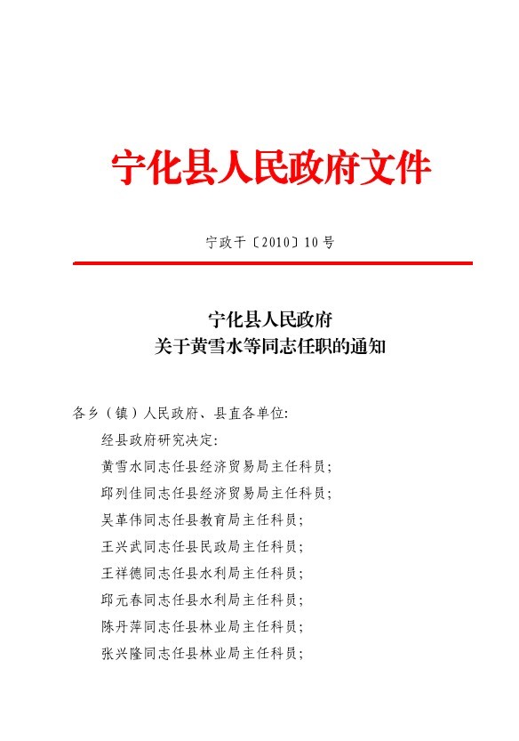 寧化縣人民政府關(guān)于黃雪水等同志任職的通知