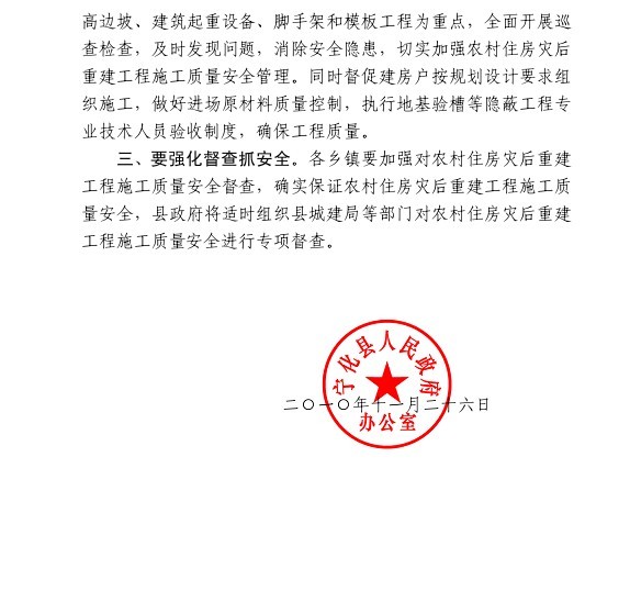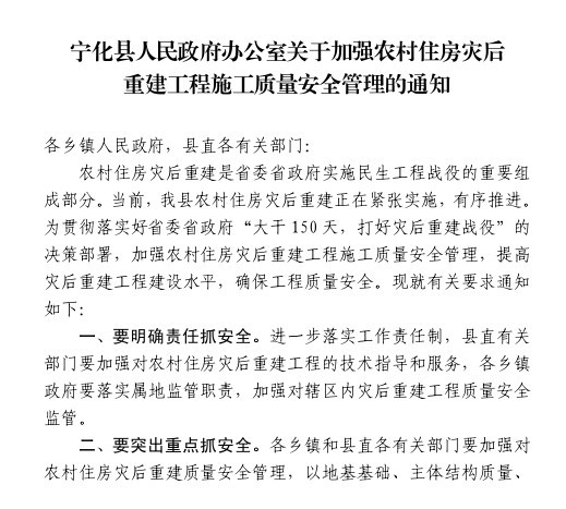 關于加強農村住房災后重建工程施工質量安全管理的通知