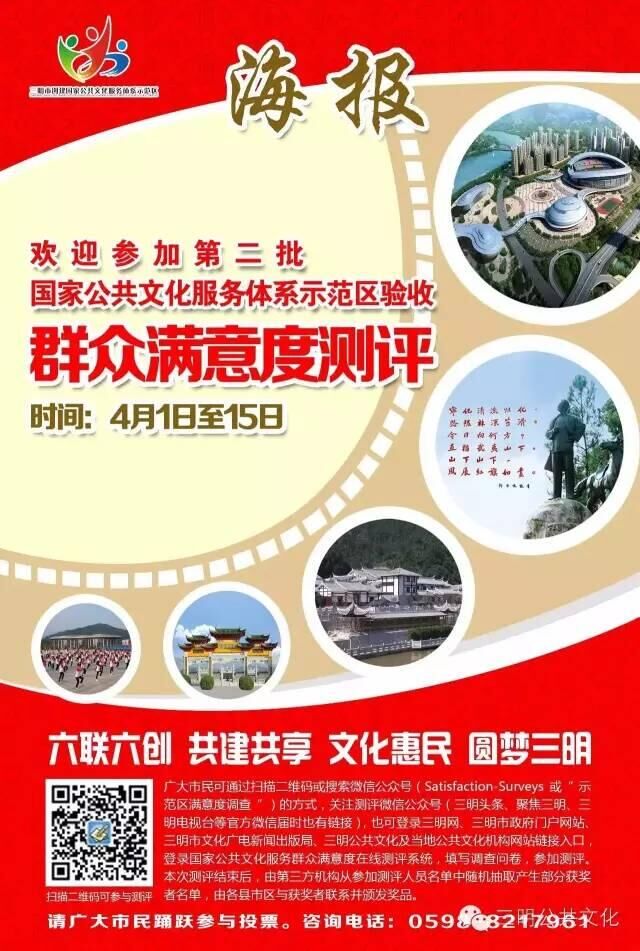 據悉,本次測評采用信息化、網絡化手段,通過微信調查和網站調查兩種方式進行。一方面,廣大市民可以通過掃描二維碼或搜索微信公眾號(Satisfaction-Surveys或搜索“示范區滿意度調查”)的方式,關注示范區創建城市國家公共文化服務群眾滿意度測評微信公眾號,關注三明市國家公共文化服務群眾滿意度測評微信公眾號(三明頭條、聚焦三明、三明日報、三明電視臺、三明公共文化等官方微信均有鏈接),填寫調查問卷。另一方面,市民可通過三明網、三明市政府門戶網站、三明市文化廣電新聞出版局、三明公共文化服務平臺及當地公共文化機構網站鏈接入口,登錄國家公共文化服務群眾滿意度在線測評系統(http://203.207.220.20/Modules/OnlineSurvey/Pages/Home.aspx),填寫調查問卷。