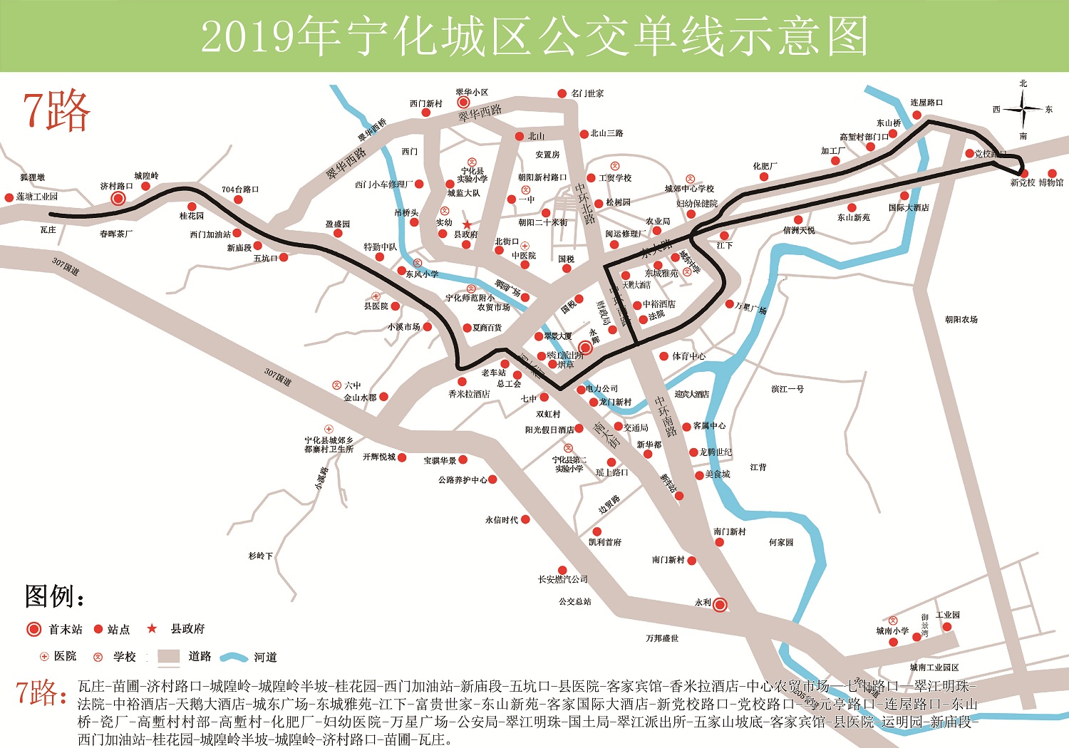 瓦莊—縣醫院—老車站—萬星廣場—客家國際—連屋路口—化肥廠—農業局—中環路—老車站—縣醫院—瓦莊
