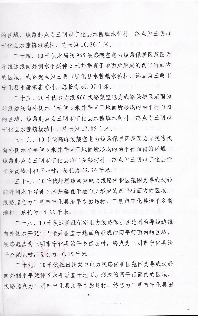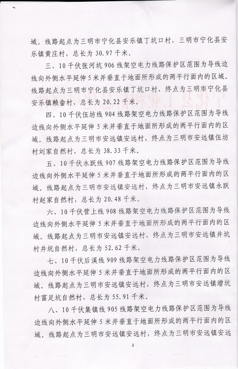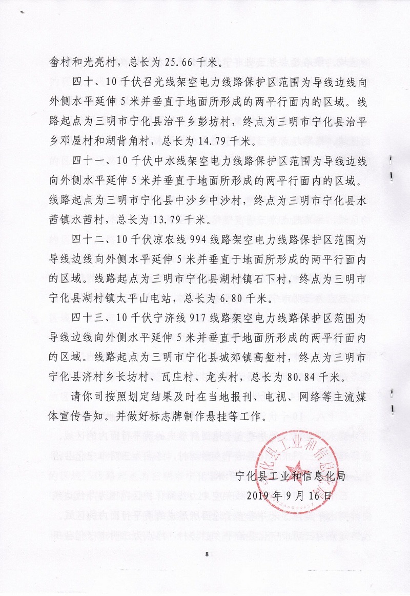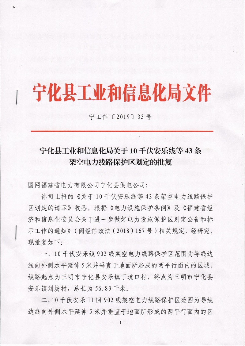 寧化縣工業和信息化局關于10千伏安樂線等43條架空電力線路保護區劃定的批復