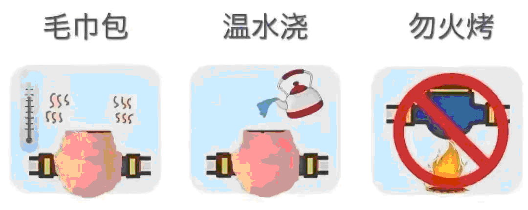 5、對已冰凍的水龍頭、水表、管道,宜先用熱毛巾裹在水龍頭上,然后澆溫水,使水龍頭解凍,再擰開水龍頭,用溫水沿水龍頭慢慢向管道澆淋,使管道解凍。若澆至水表處,仍不見有水流出,則說明水表也凍住了,此時再用熱毛巾包在水表上,用溫水(不高于30攝氏度)澆淋,使水表解凍。切勿用熱水淋或用火烤,否則會損壞水表。