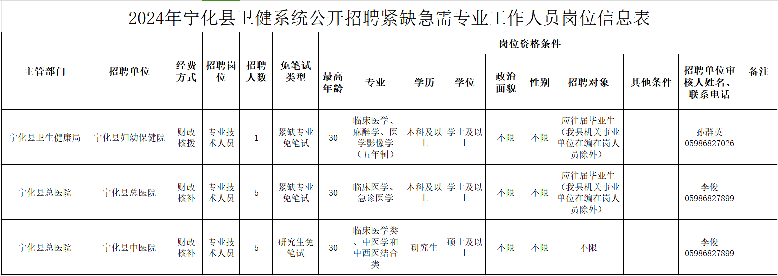 寧化縣衛(wèi)生健康局 寧化縣人力資源和社會(huì)保障局 寧化縣總醫(yī)院關(guān)于2024年寧化縣衛(wèi)健系統(tǒng)公開(kāi)招聘緊缺急需專業(yè)工作人員的通告