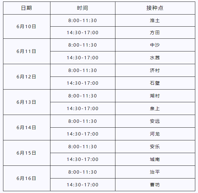 根據市新冠病毒疫苗接種工作總體安排,現將我縣6月10日-6月16日新冠病毒疫苗接種安排如下: