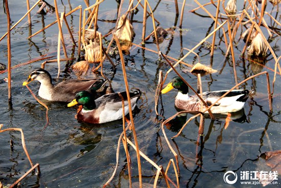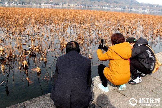 1月13日,杭州天氣晴好,幾只野鴨子在西湖游蕩,吸引游客駐足觀賞拍照。(浙江在線拍友 柱子 攝)
