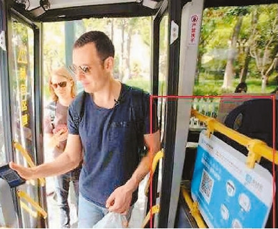 外國(guó)游客手機(jī)支付乘坐公交車。