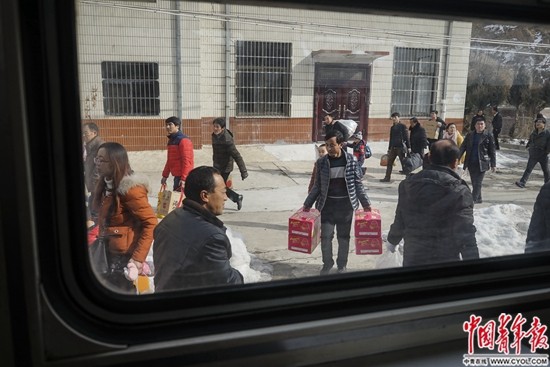 火車也連接著山村和外面的世界。鄉(xiāng)村里的學生踏上火車,前往延安、西安的學校。在鄉(xiāng)鎮(zhèn)工作的年輕人和朋友們坐上火車進城,再拎著滿滿的行李和購物袋坐火車回家。列車乘務員說,每到周末,甘泉北站到延安站之間就被學生擠滿。