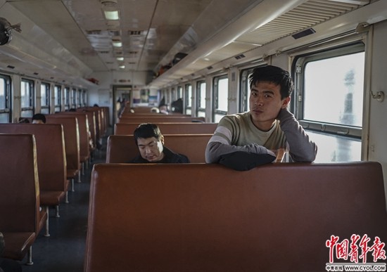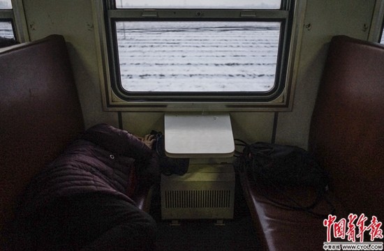 1月20日,從西安開往榆林的7006次客車上,在西安打工的李葉子(左)請了兩天假,回鄉(xiāng)探親。