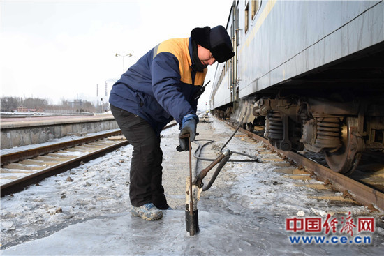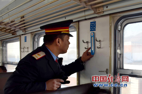 列車長仔細檢查車廂溫度。(中國鐵路沈陽局集團有限公司供圖)