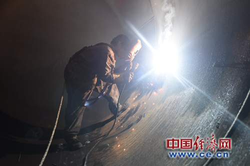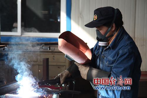 溫素霞在焊接貨車車門。經濟日報-中國經濟網記者佟明彪/攝