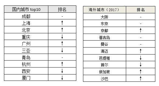 途家平臺數據顯示,2017年入住最多的民宿目的地城市中,國內TOP 10城市排名為:成都、上海、北京、重慶、廣州、三亞、青島、杭州、西安、廈門。這10個城市的間夜量合計,接近全國間夜量的六成。除北京、青島、西安以外,其余城市全部為南方城市。相比2016年,杭州排名上升5位,擠進TOP 10,濟南下降了6位,未能上榜。
