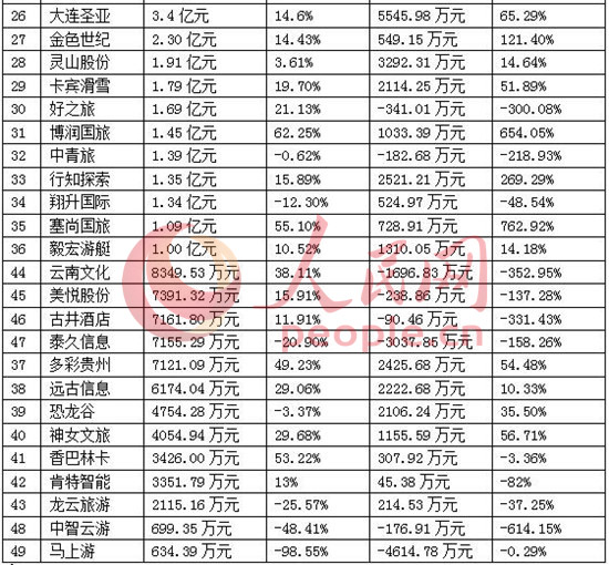 人民網北京5月3日電 (李易)據記者統計,隨著年報季的告終,49家上市旅游企業2017年的成績單陸續曝光。其中,36家旅企營收過億,八成旅企實現盈利。(詳見文末:2017年上市旅游企業業績統計表)