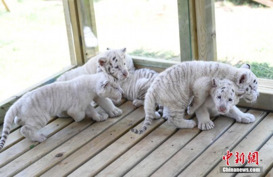 5月20日,雪虎五胞胎嬉戲玩耍。當日,以中國“五岳”名山命名的雪虎五胞胎在濟南野生動物世界與游客見面,“雪泰”、“雪衡”、“雪華”、“雪恒”、“雪嵩”5只小雪虎模樣呆萌,十分可愛。 中新社記者 張勇 攝