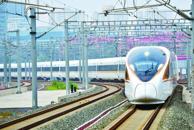 長編組“復(fù)興號”列車車身兩側(cè)有長長的金色腰線,因而被大家愛稱為“大長金”。本報記者 和冠欣攝