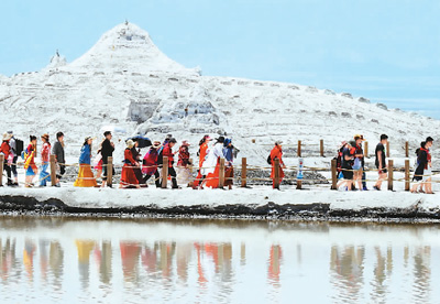 眾多游客在青海茶卡鹽湖休閑游玩。 |
