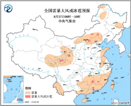 據中央氣象臺網站消息,預計8月27日08時至28日08時,內蒙古中部、甘肅中西部、河北北部、山東中東部、湖南南部、江西中南部、浙江東部、福建、云南西南部、廣西、廣東、海南島東部和臺灣島等地的部分地區將有短時強降水天氣,小時雨強20-50毫米,局地可達60毫米以上;另外,內蒙古中部、青海東南部、湖南南部和江西南部等地的局地將有雷暴大風或冰雹天氣。