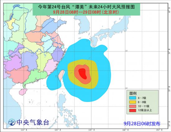 大風預(yù)報:28日08時到29日08時,東海大部、浙江沿海、福建沿海、臺灣沿海、臺灣海峽、巴士海峽、南海東北部將有6-7級大風,陣風8-9級,東海東南部和臺灣以東洋面將有8-11級大風,臺風中心經(jīng)過的琉球群島以南洋面的部分海域風力可達12-14級,陣風15-16級。