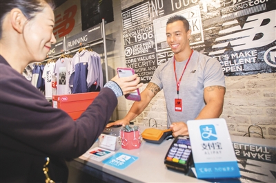 中國游客在澳大利亞悉尼的一家運動品牌店內通過手機支付方式購買商品。 |