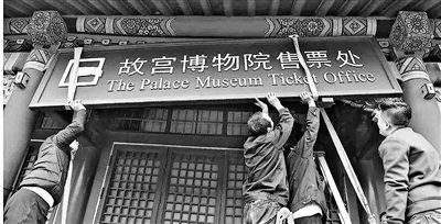 2017年10月10日中午12點,故宮博物院售票處的牌匾被工作人員緩緩摘下