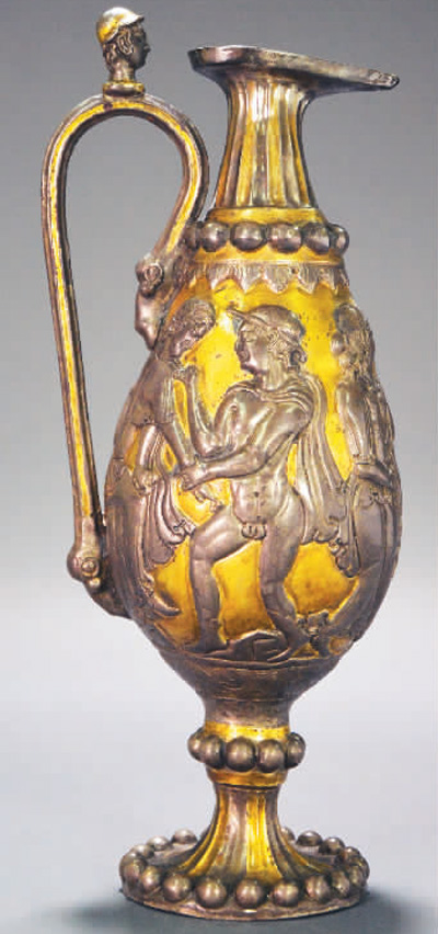 鎏金銀壺是通過絲綢之路傳到中國的薩珊風格金銀器。壺通高37.5厘米,最大腹徑12.8厘米,重1.5千克。表面鎏金,環形單把,把上方鑄一高鼻深目、戴貼發軟冠的人頭。細長頸,腹部圓鼓,頸部與腹部連接處、束腰處及底座均飾有凸起的圓珠組成的聯珠紋。壺腹部捶揲出男女3組人物圖像,構成一幅連續的古希臘神話故事。“此壺是波斯薩珊系金銀器在中國的重大發現,它的面世將固原、中亞、希臘聯系到一起,堪稱東西方文化交流中的藝術精品。”王效軍講解道。