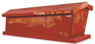 北魏漆棺畫1981年出土于固原市西郊鄉雷祖廟村的一座北魏夫婦合葬墓中,出土時棺木已經完全腐朽,只留下一層薄薄的漆皮,經專家拼對復原后,再現了棺蓋、左、右側檔、前檔四部分漆棺彩畫。棺蓋為兩面坡式,前高寬,后低窄,這是鮮卑民族棺木的重要特征之一。棺蓋中央繪有一條金色水渦紋長河,河中點綴著仙鶴,象征天河。天河兩側飾有纏枝卷草紋和人面鳥身的仙人形象。天河頂端左側有一紅色太陽,右側有一白色月亮,其下方各有一座房屋,屋內分別坐著一男一女,據其文字推測為“東王父”和“西王母”。