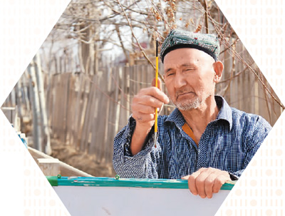 今年75歲的阿卜力克木·麥麥提敏是新疆墨玉縣扎瓦鎮(zhèn)庫木艾日克村土生土長的農(nóng)民畫家。他一邊勞動一邊作畫,用一雙布滿老繭的手,開啟了一個甲子的繪畫之旅,創(chuàng)作出1.5萬余幅作品。大漠胡楊、戈壁草原、瓜果飄香……完美呈現(xiàn)了大美新疆的風光和風情。