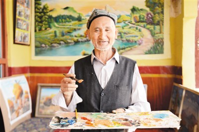 自幼喜歡畫畫的阿卜力克木·麥麥提敏15歲時與油畫結緣。沒有老師,他從臨摹畫冊學起,色彩勾兌、如何上色,憑著自己的感覺反復琢磨,不斷用畫筆描繪著大美新疆。