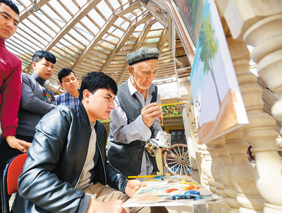 阿卜力克木·麥麥提敏(右一)在家中教徒弟們油畫的繪畫技巧。 |