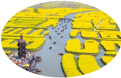 游客在江蘇興化千垛景區(qū)乘船觀看油菜花。 |
