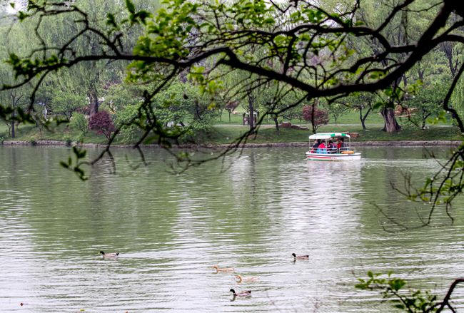 瘦西湖上的小船悠悠,煙柳,碧桃,拱橋,亭閣,一切都和畫(huà)中的風(fēng)景一般無(wú)二。精致婉約,細(xì)膩嬌美。熙春臺(tái)前、五亭橋上,游客們撐著花花綠綠的傘,構(gòu)成一道獨(dú)特的風(fēng)景線(xiàn)。湖上穿梭的畫(huà)舫、花葉上滾動(dòng)的水珠、雨中嬉戲的黑天鵝……細(xì)雨霏霏的五一小長(zhǎng)假,給多愁善感的揚(yáng)州城籠上一層輕紗,更添一層?jì)趁模屇阈膭?dòng)。